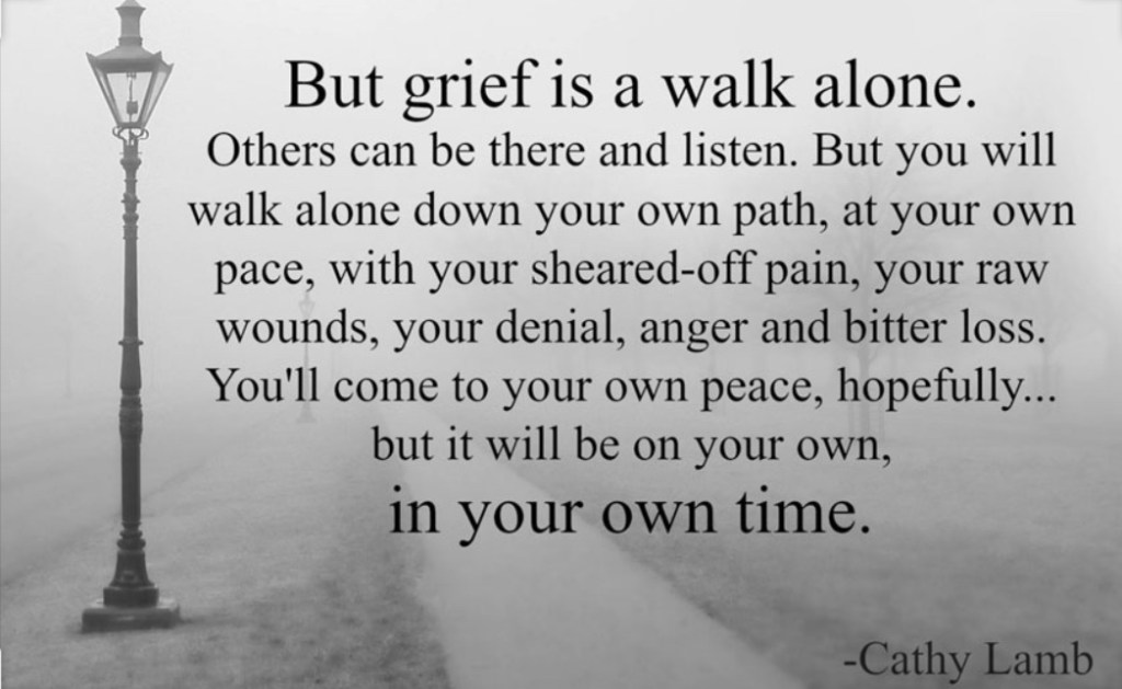 Grief is very personal and a lifelong process. We never ‘get over’ someone’s death. NEVER. We learn to live life with a new direction and a new or added purpose.